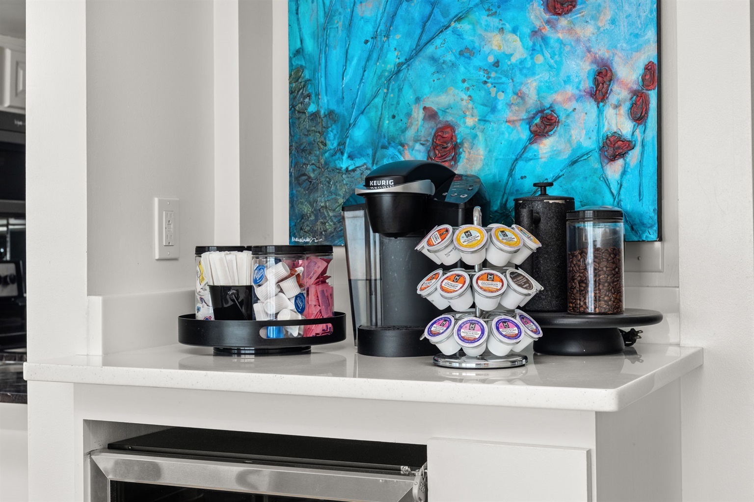 Spacious and Modern Kitchen: Fully stocked with updated appliances, gorgeous granite countertops, and a Keurig coffee maker complete with creamers and sugars.
